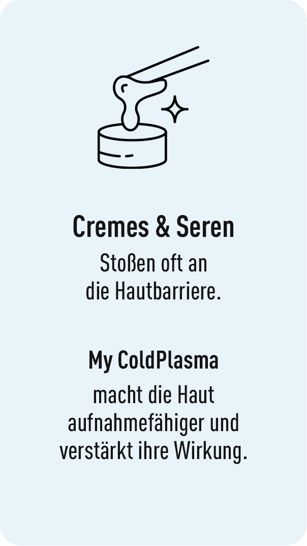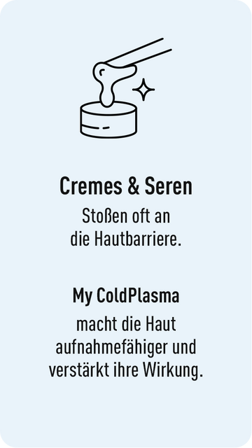Weiterhin wird die Aufnahme und Wirkung von Wirkstoffen in Cremes und Seren im Hautorgan durch die Kaltplasmaanwendung verbessert. Gerade die entzündungshemmende Wirkung kann vielfältige Hautprobleme reduzieren. Allerdings solle bei fortschreitenden Erkrankungen der Haut dann eine professionelle Behandlung bei einem/einer Dermatologen/Dermatologin erfolgen.
