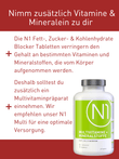 Nimm während der Verwendung der N1 Fett-, Zucker- & Kohlenhydrate Blocker Tabletten jeden Tag ein Multivitamin und Mineralienpräparat ein. Die N1 Blocker Tabletten verringern den Gehalt an bestimmten Vitaminen und Mineralstoffen, die vom Körper aufgenommen werden. Nimm das N1 Multivitaminpräparat am besten vor dem Schlafengehen ein, um sicher zu sein, dass die Vitamine und Mineralstoffe auch wirklich vom Körper aufgenommen werden.
