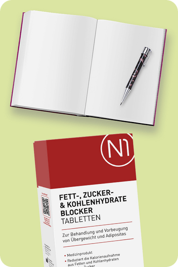 Ein Ernährungstagebuch kann dich zusätzlich beim Abnehmen unterstützen. Du erhältst einen besseren Überblick darüber, was und wie viel du täglich isst und trinkst. Im Laufe der Zeit wirst du sehen, dass du durch die Einnahme der N1 Fettblocker Tabletten kleinere Portionen zu dir nimmst und Zwischenmahlzeiten auslassen wirst. Außerdem solltest du dir realistische Ziele setzen und dich nicht überfordern. Das hilft, motiviert zu bleiben und Schritt für Schritt dein Wohlbefinden zu verbessern. N1 Fettblocker Kapseln reduzieren den Appetit durch Sättigung des Magens und durch die Förderung eines gesunden Blutzuckerspiegels.