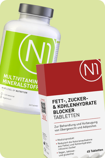 Nimm während der Verwendung der N1 Fett-, Zucker- & Kohlenhydrate Blocker Tabletten jeden Tag ein Multivitamin und Mineralienpräparat ein. Die N1 Blocker Tabletten verringern den Gehalt an bestimmten Vitaminen und Mineralstoffen, die vom Körper aufgenommen werden. Nimm das N1 Multivitaminpräparat am besten vor dem Schlafengehen ein, um sicher zu sein, dass die Vitamine und Mineralstoffe auch wirklich vom Körper aufgenommen werden.