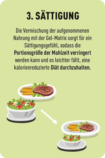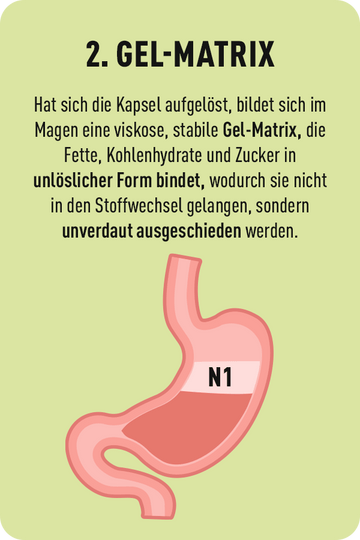 Die Tablette entfernt Zucker, Kohlenhydrate und Fett aus deiner Nahrung & sorgt dafür, das sie ausgeschieden werden, ohne in deinen Stoffwechsel zu gelangen. Gleichzeitig wird in deinen Magen eine Gelmatrix gebildet, die ein Sättigungsgefühl hervorruft.