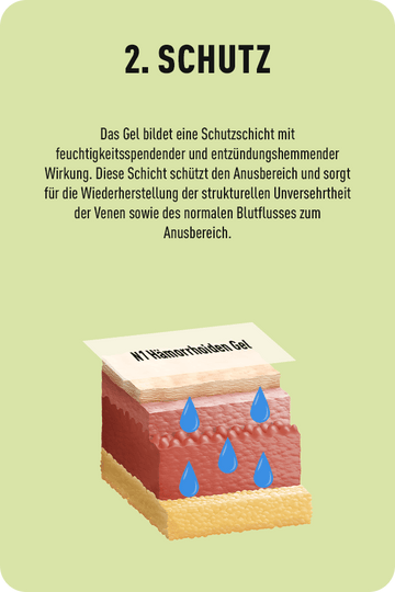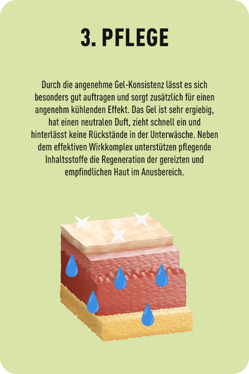 Entzündungshemmende und feuchtigkeitsspendende Wirkung. Das Gel verringert die Infektionsgefahr, indem es Bakterien daran hindert, in die Haut einzudringen. Es hilft bei Hämorrhoidenprolaps, bevor sich dieser ausweitet und hat eine glättende Wirkung bei hartem Stuhlgang.