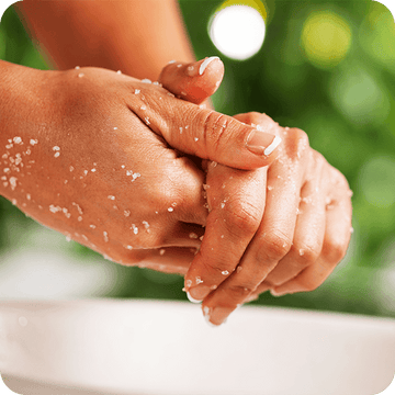 Verwende gelegentlich ein sanftes Peeling oder eine Handmaske, um abgestorbene Hautzellen zu entfernen und die Haut aufnahmefähiger für Feuchtigkeit zu machen.
