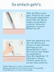 Bei der Anwendung wird kein Kunststoffapplikator benötigt, da der Dosierkopf so geformt ist, dass die Warze gezielt behandelt werden kann.